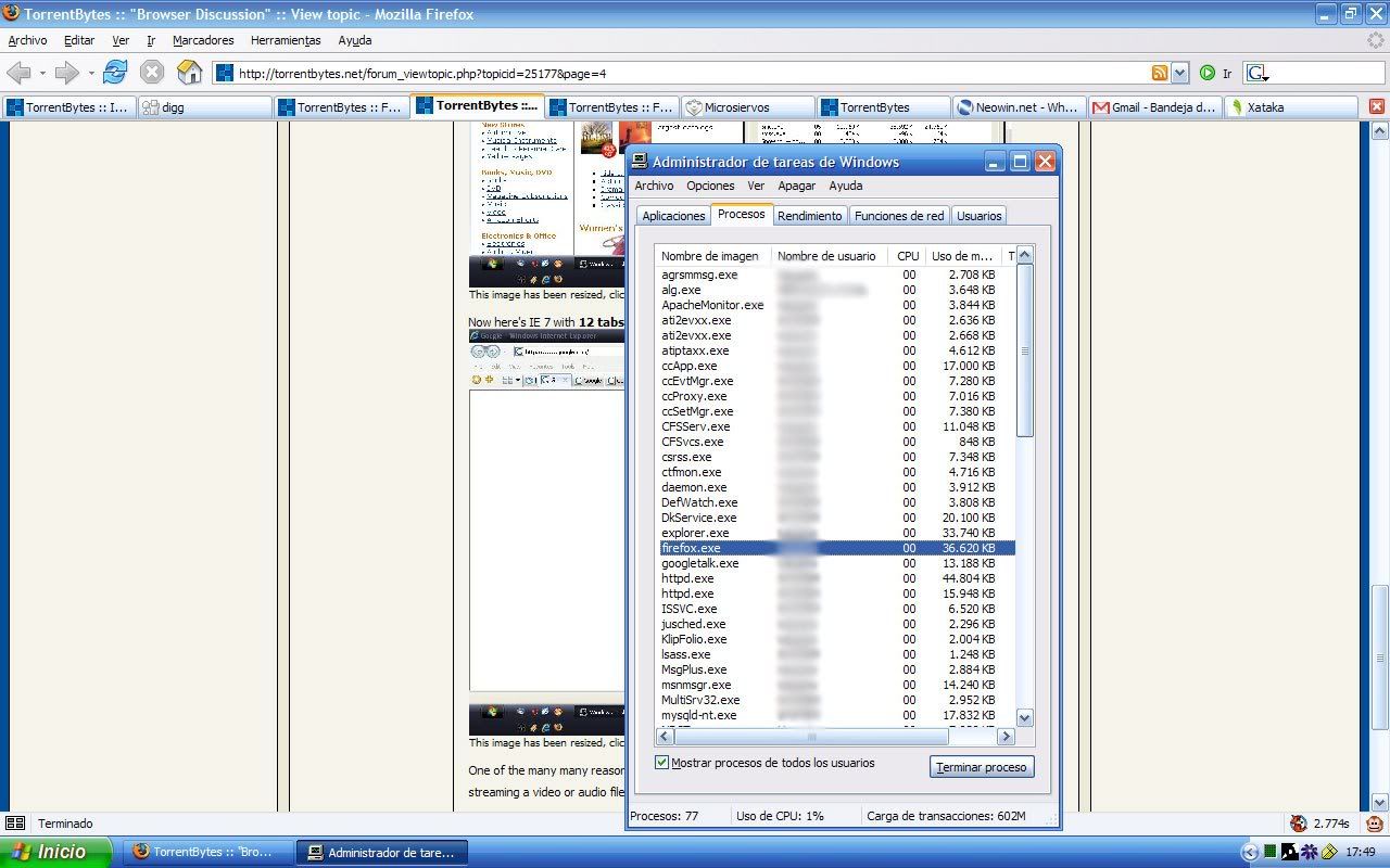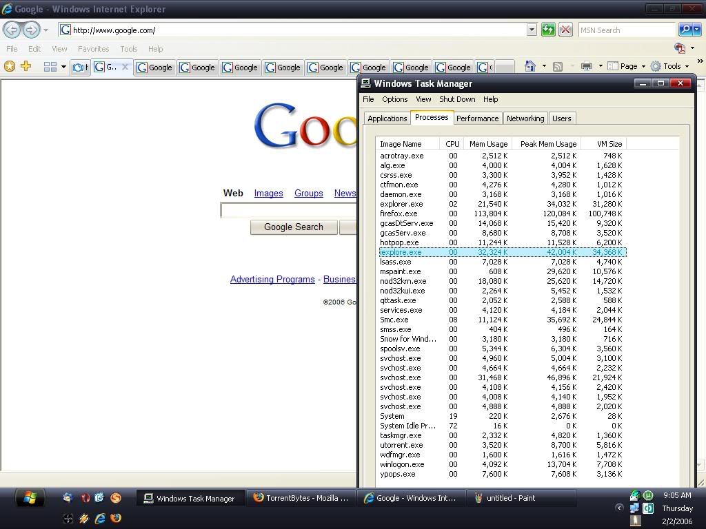 Now here's IE 7 with 12 tabs...mostly just google pages...32 Mb.