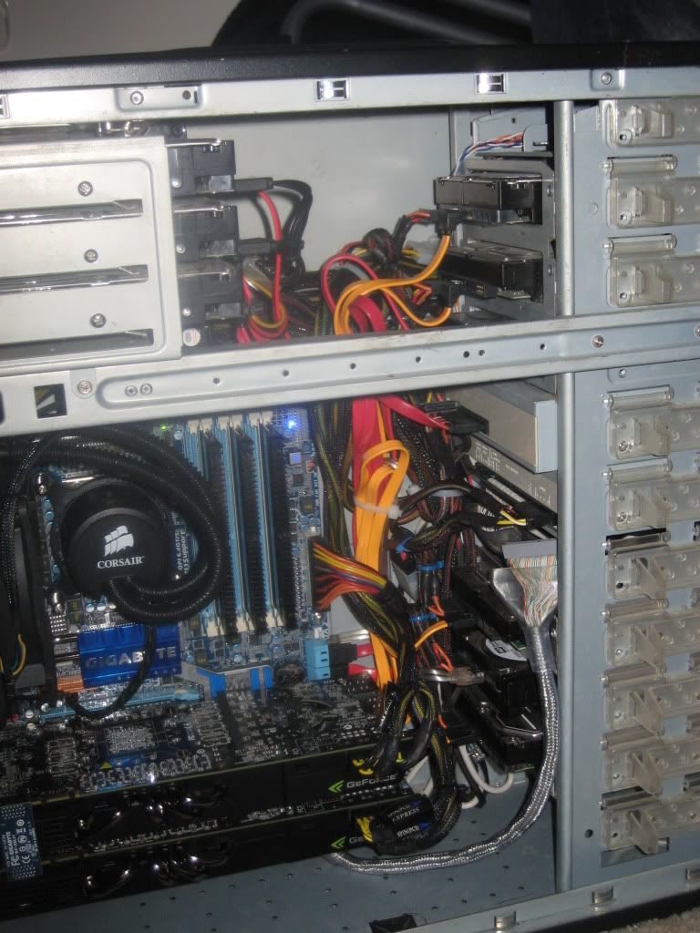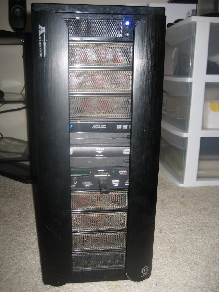 This is my server rig which also works as my media center. The glowing thing on the front is a SilverStone SST-CFP51B drive bay converter.