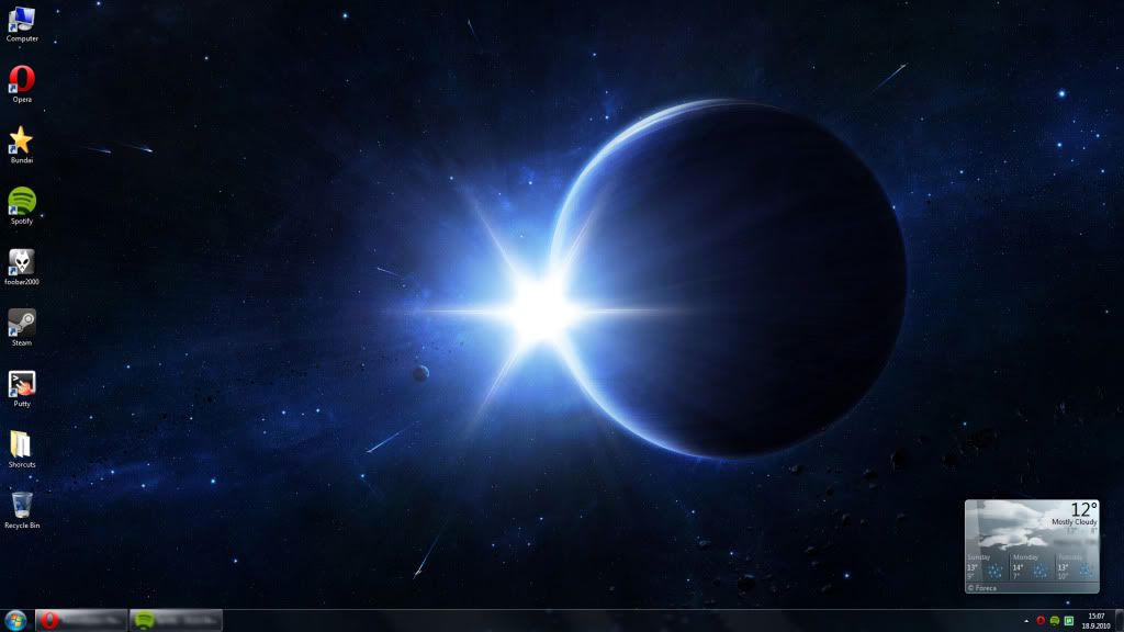 I got bored of plain black wallpapers and theme so I decided to take HDR photo of a rose and have a bright red desktop And two screens is a killer. With Windows 7, who needs shortcuts on the desktop?